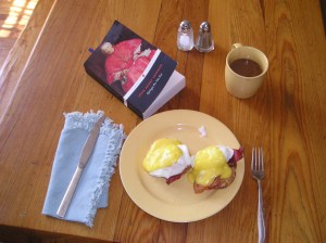You will note the very simple Eggs Benedict atop bacon and English Muffins. The delicious coffee fresh ground Medium Roast from an oily bean brewed in my – now broken espresso/cappuccino maker (the “frother” handle snapped off-but the coffee still brews) – stands on the right and Cardinal Newman’s Apologia sits on the left. You can see that I set the table in a hurry in my failure to consider the proper placement of the knife and fork. The truth is that I really don’t like cold eggs.