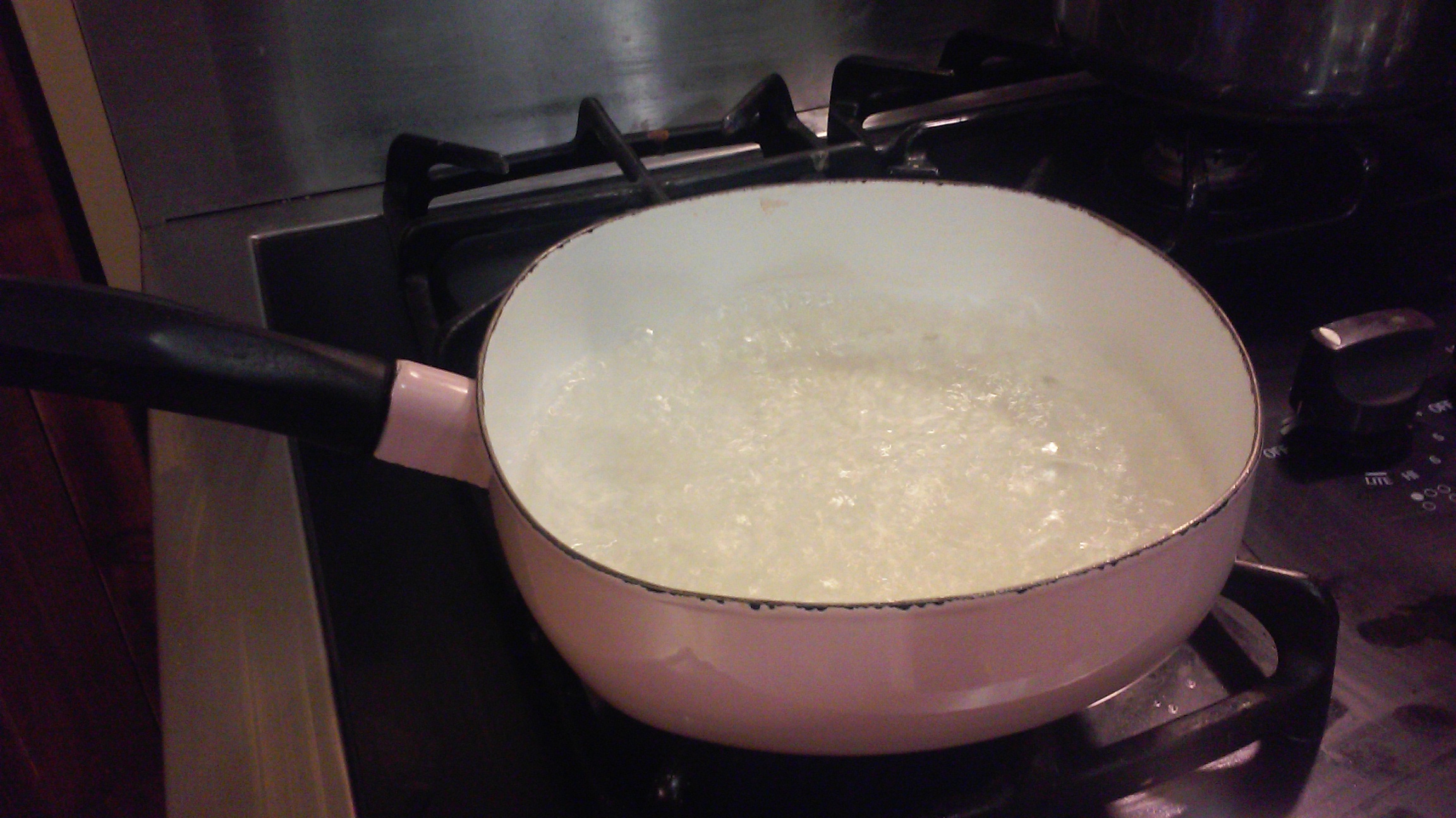 The next step is to transfer the fermented beer (formerly wort) into a new glass Carboy. But since I am going to bottle the beer now, I will dissolve a packet of priming sugar into two cups of water and boil that for five minutes.